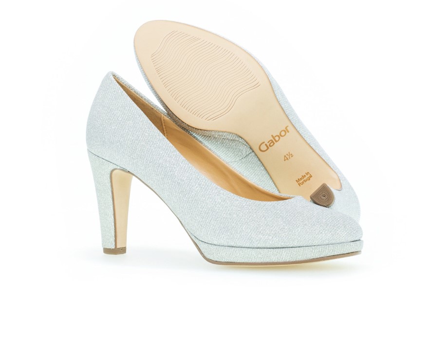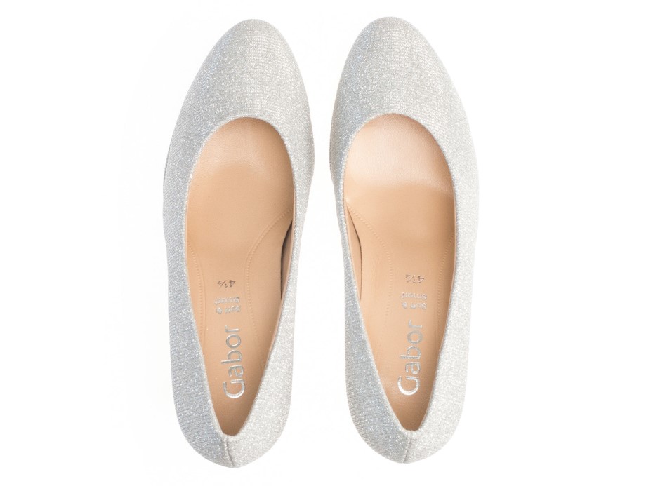 Os Sapatos De Corte Prateados Gabor 71.270.60 São Uma Peça Marcante. A Parte Superior Prateada Brilhante Certamente Chamará A Atenção. O Salto De 6 Cm E O Design Sem Cadarço Garantem Facilidade De Uso, Mantendo O Estilo E A Durabilidade. Aqui Na Gabor Shoes Ireland Achamos Que O Sapato Gabor 71.270.60 Prata Ficaria ótimo Combinado Com Um Vestido Preto Ou Saia Midi Para Um Look Noturno. Material Superior: Sintético Material Do Forro: Couro E Material Sintético Da Sola: Sintético Altura Do Salto: 6,5 Cm Palmilhas Removíveis: Não